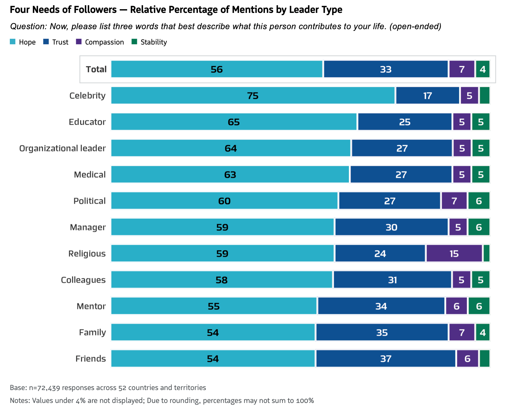 This year Gallup released a poll on leadership, asking people around the world what they expect and need from their leaders. This applied to any kind of leader in their lives: mostly family members, but certainly managers and politicians, even celebrities. A number of qualities emerged across ages and nations: trust, stability, etc. But #1 on the list, by far, with nothing else even coming close: hope. Celebrities had the strongest correlation with hope as a leadership quality, mentioned by 75% of respondents. What are cable hosts if not celebrities?